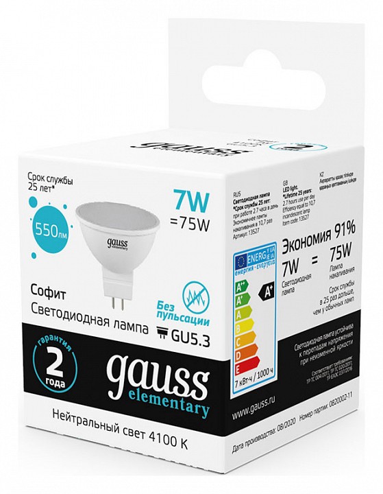 | Альтернативное название | Лампа светодиодная Gauss Софит GU5.3 7Вт 4100K 13527 |