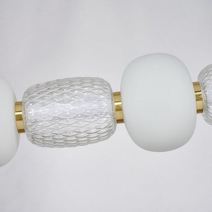 Металлический каркас цвета золота, плафоны в виде бусин разнообразных форм из выдувного стекла двух видов - прозрачного и цвета опала, часть каркаса фиксируется тросиком для баланса. Чередование стеклянных плафонов разной формы, цвета и рисунка, а также цветовое решение каркаса в золоте создает насыщенный сложный и дорогой образ. Плафоны из стекла выдуваются вручную